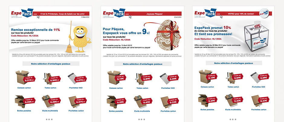 Logiciel(s): Flash, Photoshop, Illustrator, Dreamweaver, Sarbacane Description: Creation of a graphical charter, the catalog design, sign and monthly newsletter for ExpePack